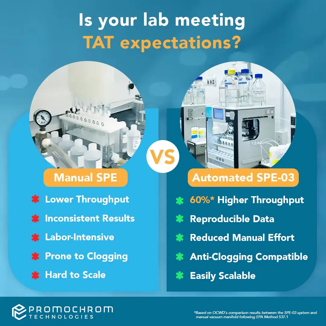 เมื่อมีตัวอย่างจำนวนมากและมีความซับซ้อนสูง การทำ SPE ด้วยมือจึงใช้เวลานาน เสี่ยงต่อข้อผิดพลาดจากมนุษย์ และมีค่าใช้จ่ายสูงจากการใช้อุปกรณ์จำนวนมากนั่นเองค่ะ